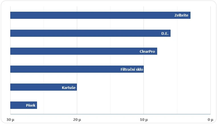 Naprosto základní částí bazénu je filtrační okruh, který se i v tom nejzákladnějším provedení neobejde bez filtračního monobloku (zpravidla čerpadlo + filtrační nádoba). Úkolem monobloku je samozřejmě filtrování vody, avšak kvalita této filtrace je nejvíce závislá na použitém filtračním médiu/technologii. Uvedený graf zobrazuje teoretické filtrační schopnosti v mikronech. Jinak řečeno, jak malé částice je toto médium schopné v sobě zadržet.